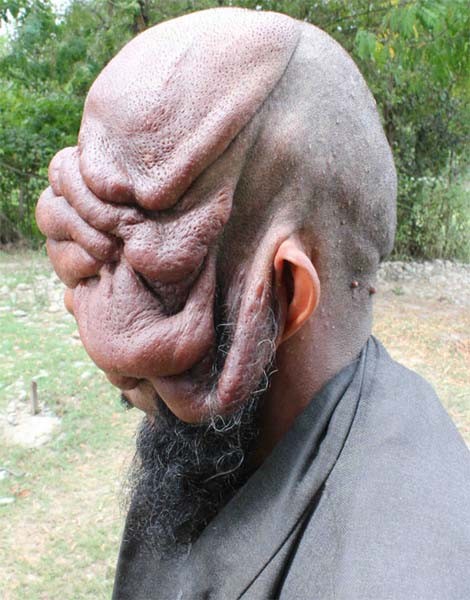 Mohammad Latif Khatana, 32, from Kashmir, India, (pictured here) cannot see or work due to the severe creases on and in his face. Strangers have spit on the road as he walks by, disgusted by his features. He is now over the moon that his wife is seven months pregnant, but worried his son or daughter will look like him.